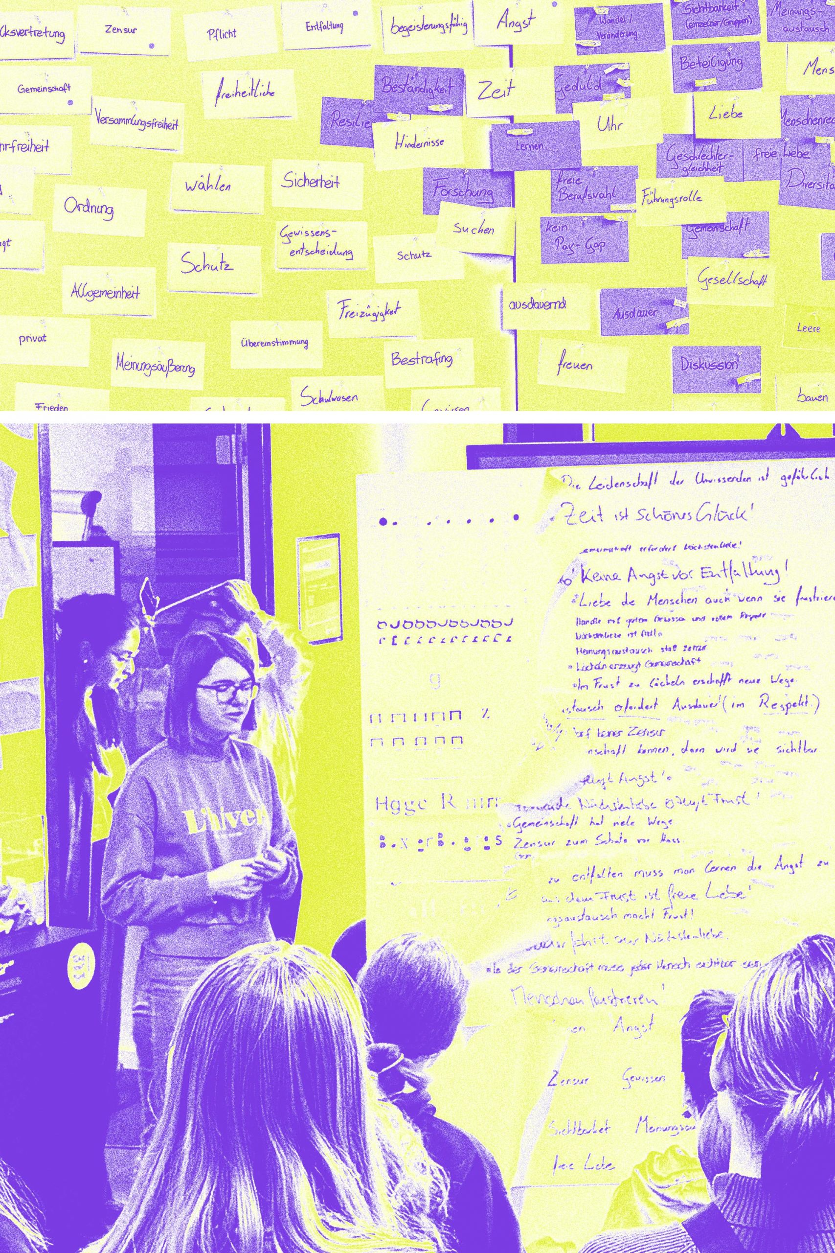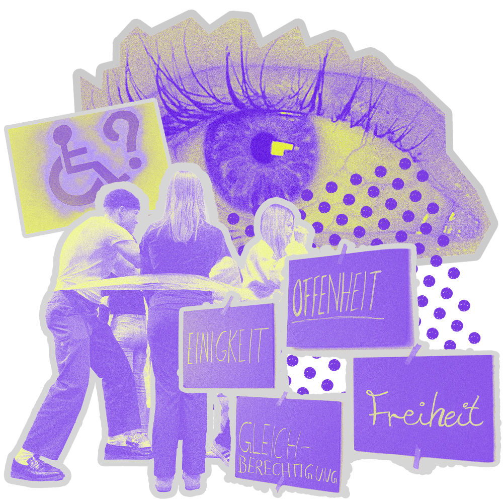 In diesem Workshop setzt Ihr Euch kreativ mit demokratischen Werten auseinander. Ausgangspunkt ist ein selbstgewähltes Wort, etwa »Stimme«, »Vielfalt« oder »Zugang«, das individuell für Demokratie steht. Dieses Wort wird zum Ausgangspunkt einer gestalterischen Auseinandersetzung: Durch analoge und digitale Techniken wie Collage, Zeichnung, Typografie oder Materialexperimente entstehen visuelle Statements, die Haltung zeigen und zur Diskussion anregen.