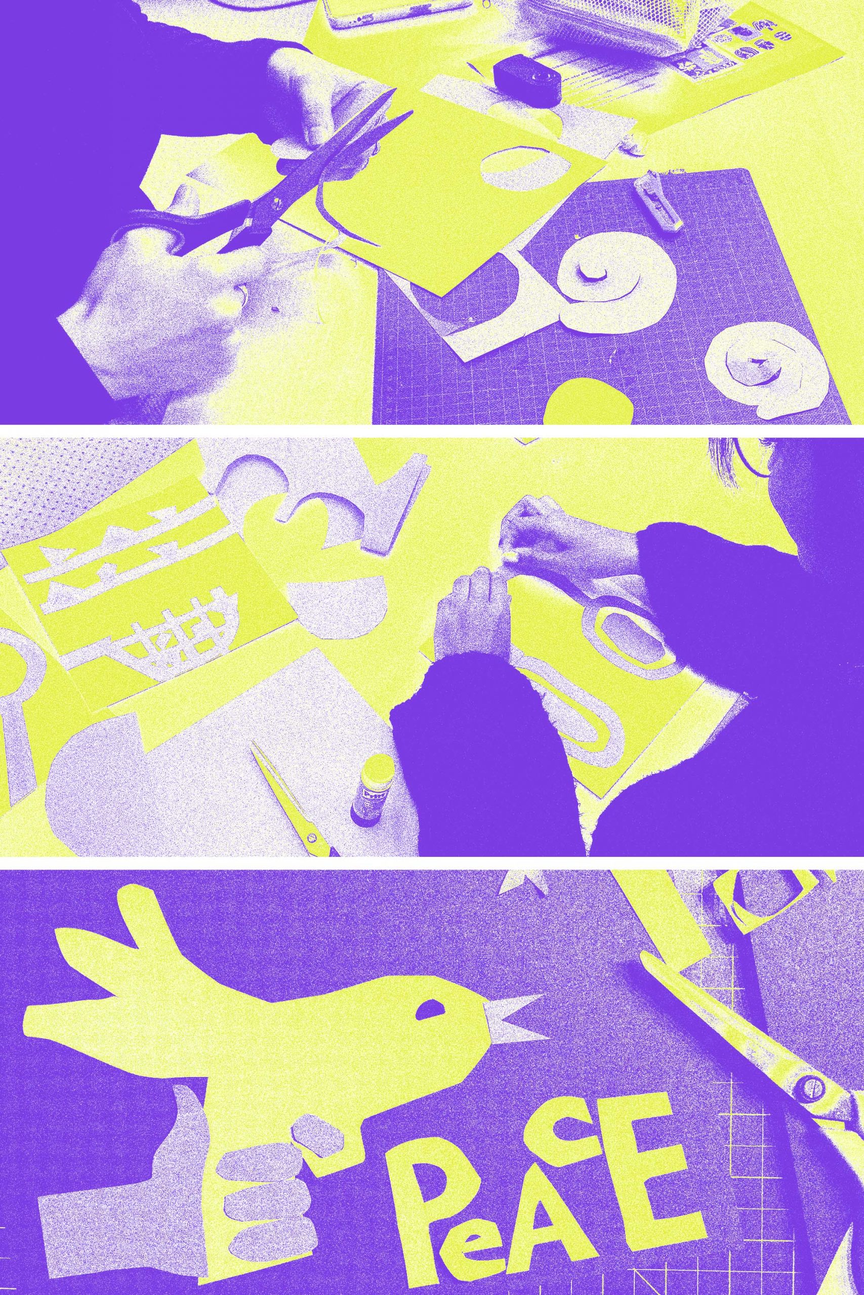 Wir arbeiten mit bewusst reduzierten grafischen Mitteln, direkt, haptisch und experimentell. Wir „malen mit der Schere“, nach einer Technik von Henri Matisse: Farbiges Papier wird spontan geschnitten, gerissen, bemalt, geklebt, gefaltet und neu zusammengesetzt. Aus Fragmenten entstehen Zeichen – roh, poetisch, klar oder widersprüchlich. Die Einfachheit der Technik schafft Raum für starke Symbole und persönliche Botschaften. Aus den Collagen entwickeln wir symbolische Bildzeichen für Plakate, Sticker, Social-Media-Posts oder andere Formen öffentlicher Sichtbarkeit. Zeichen, die Haltung zeigen, Fragen stellen und verbinden.